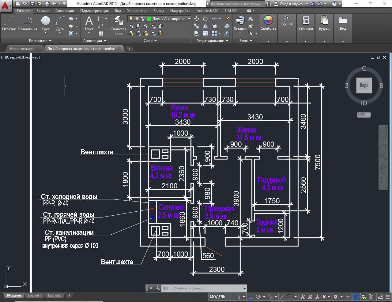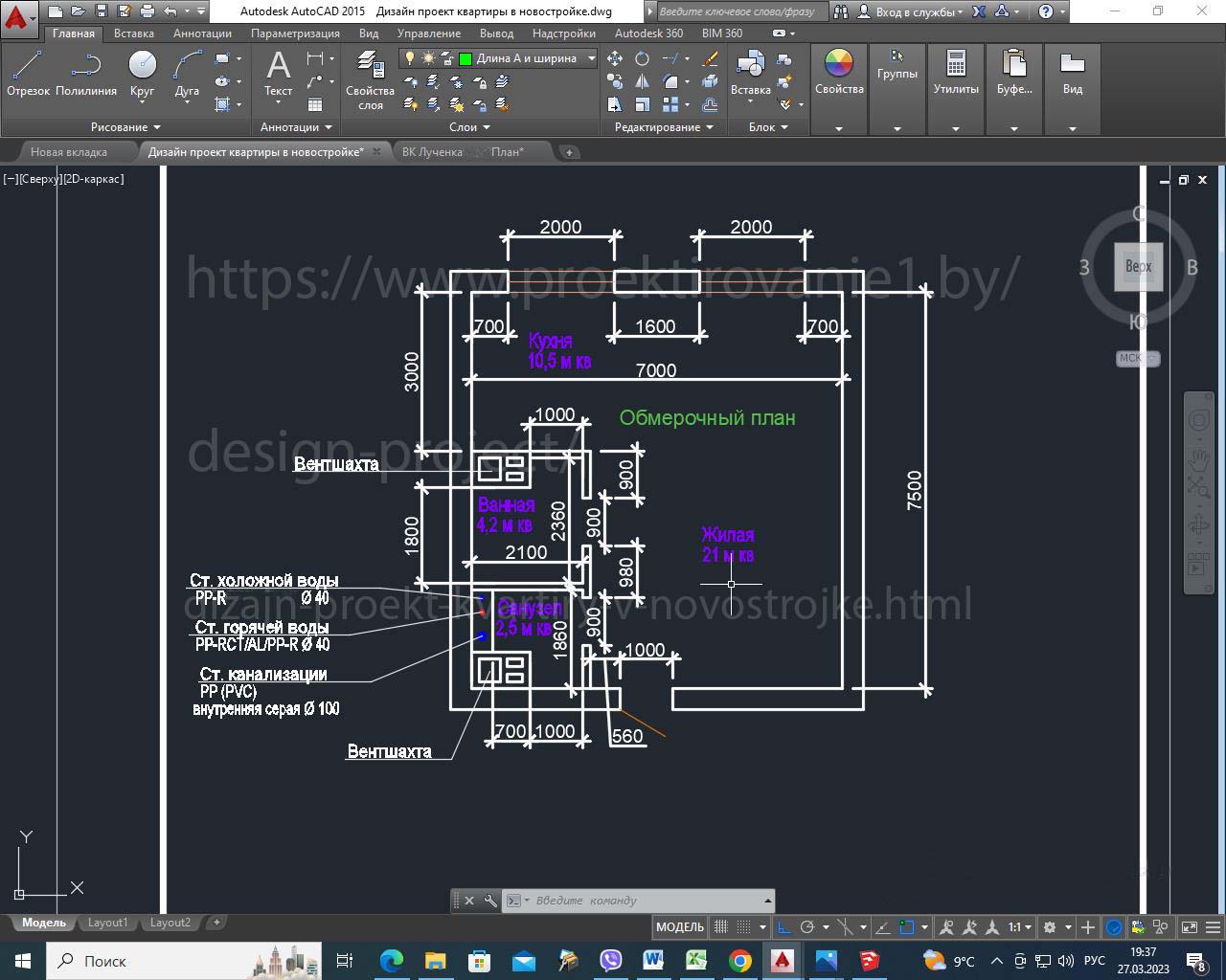 В квартире делаются замеры. Разрабатывается первая версия технического дизайн проекта в виде 2D планов. Составляется обмерочный план помещений с исходными планами от застройщика, указываются существующие стояки холодной и горячей воды, труба канализации, вентшахта.