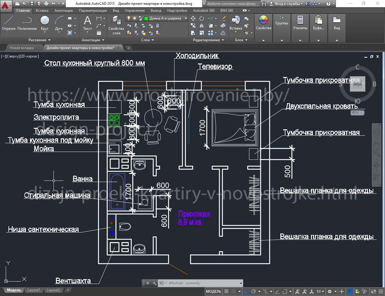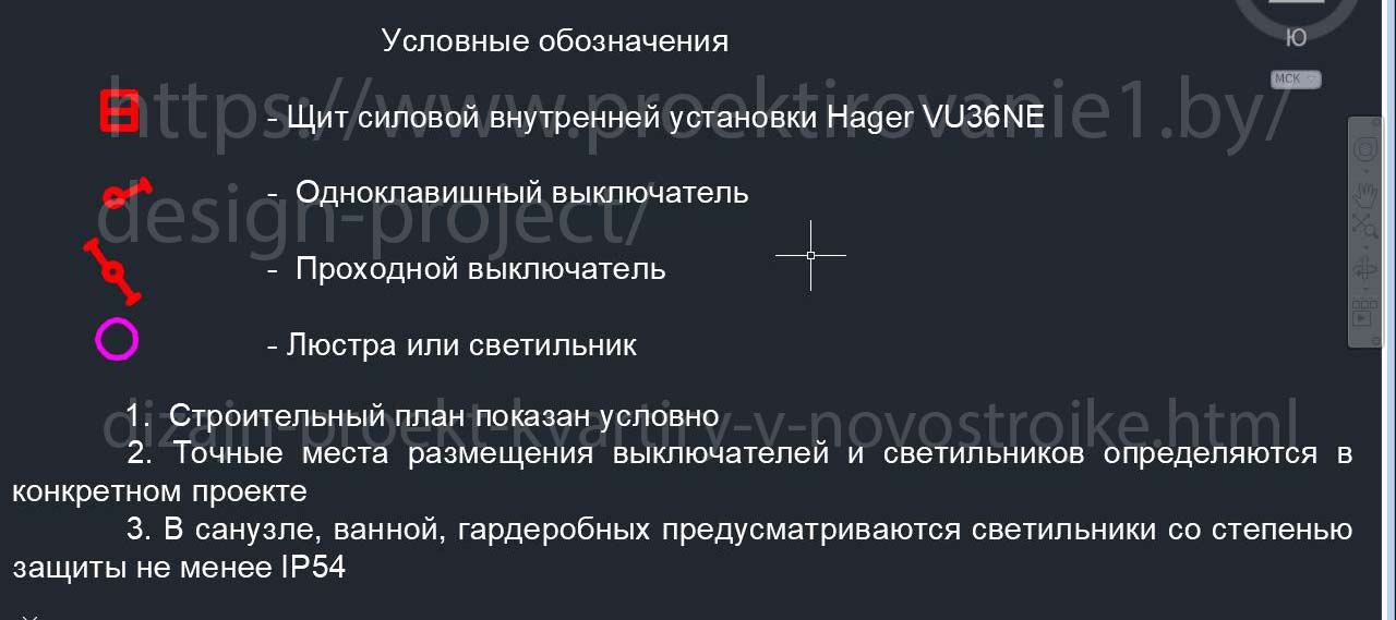 В техническом дизайн проекте квартиры указывается тип светильников: точечный, подвесной, люстра или закрытые осветильные приборы для ванной комнаты.