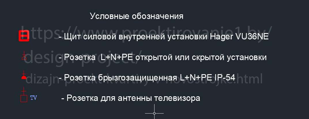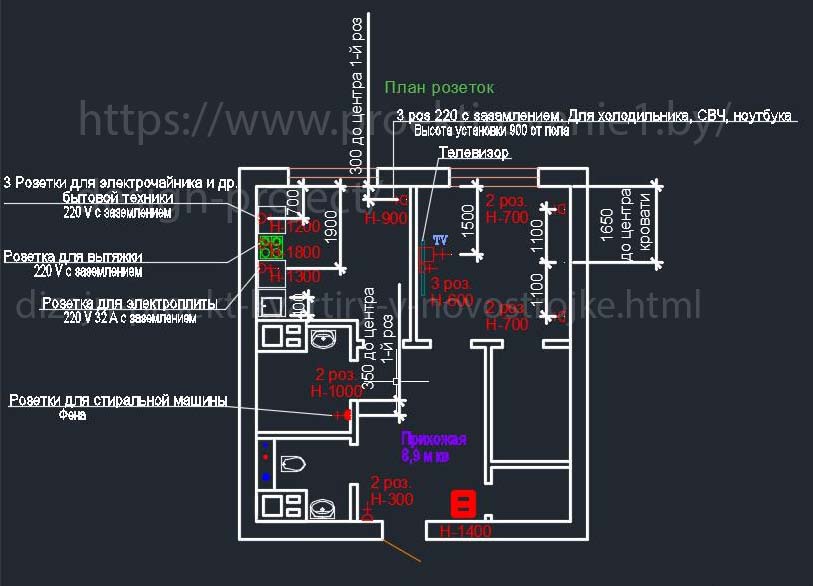 С учетом расположения мебели наносятся силовые розетки и их количество с указанием привязок. Указываются телевизионные розетки а также слаботочные для телефона, интернета.