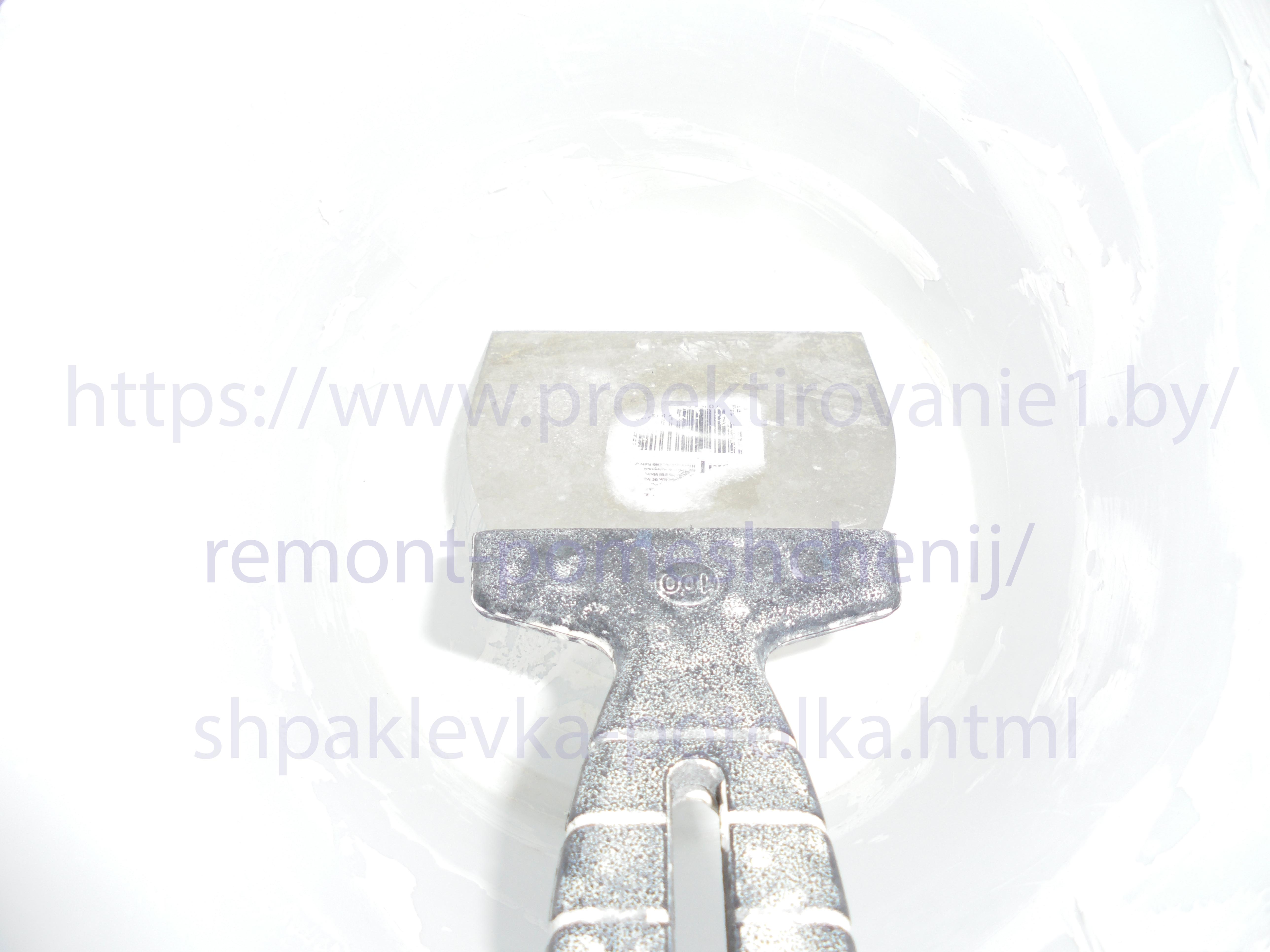 Перед покраской бетонного потолка поверхность нужно предварительно подготовить. Старую побелку снимаю меллическим шпателем в виде лопатки.